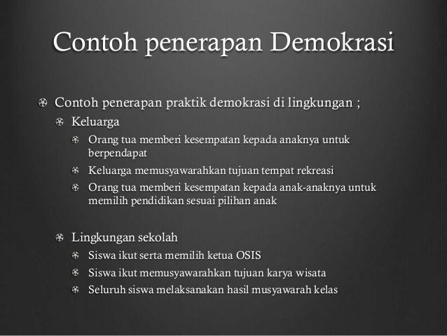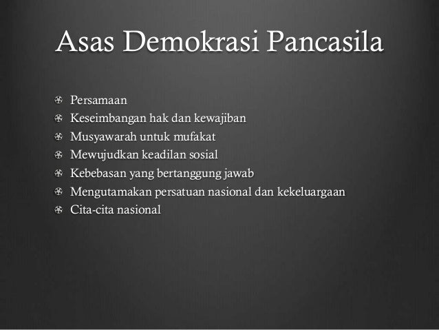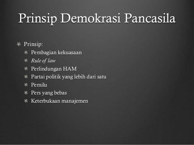 Demokrasi yang dianut oleh bangsa Indonesia sampai saat ini adalah demokrasi Pancasila. Yaitu, pelaksanaan demokrasi di Indonesia dilakukan atas dasar Pancasila. Dengan kata lain adalah paham demokrasi yang bersumber pada kepribadian dan falsafah hidup Pancasila.